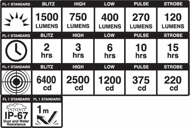 Blitz mode: 2 hour at 1,500 lumens High mode: 3 hours at 750 lumens Low mode: 6 hours and 400 lumens Pulse mode: 10 hours at 270 lumens Strobe mode: 15 hours at 120 lumens |