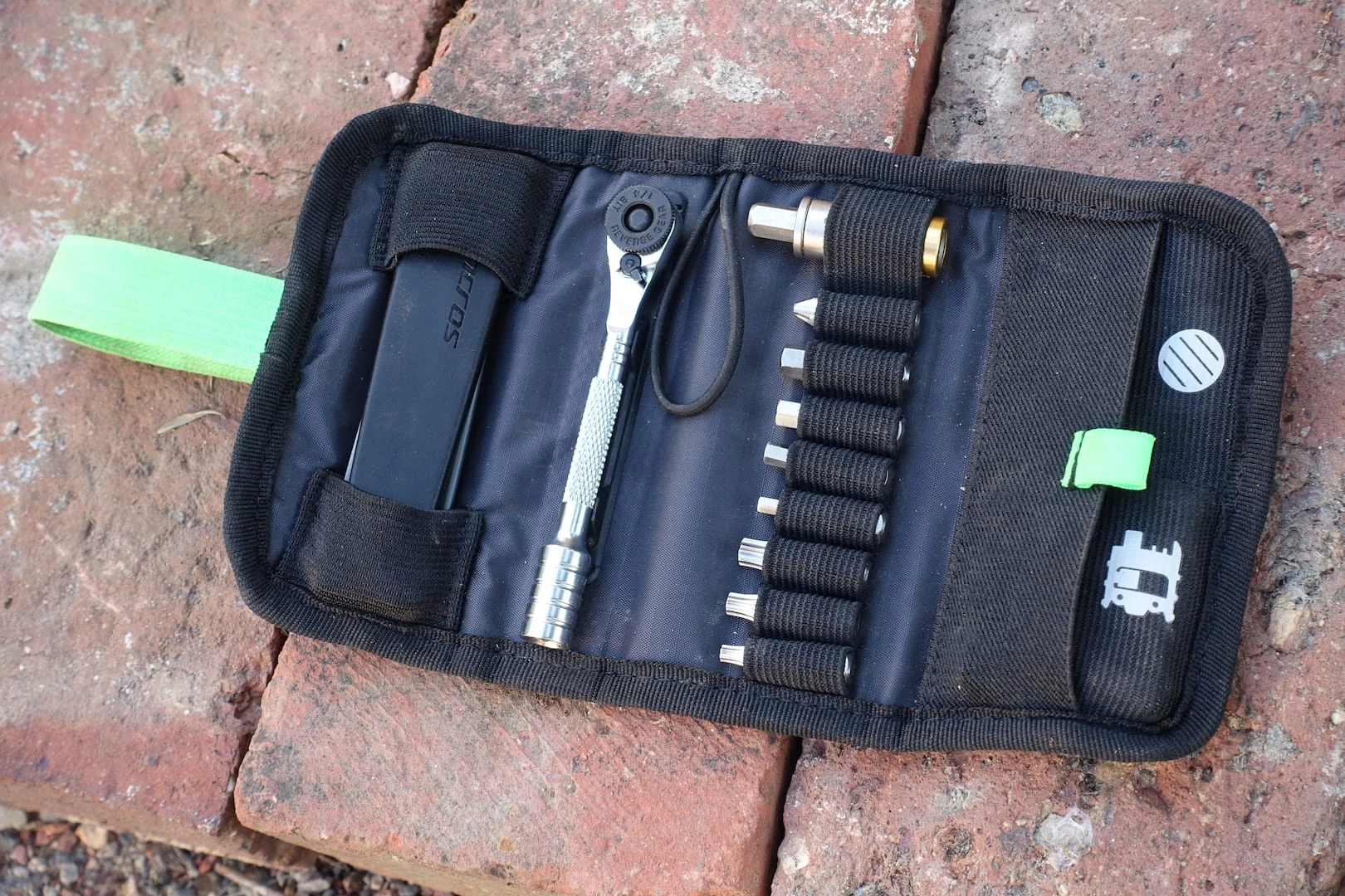 - The essential trail tool kit featuring a ratchet driver with 9 bits and 5Nm Torque adapter, chain tool, tyre levers, glueless patch kit and key loop helpfully packaged in a simple but secure tool wrap. Perfect for the jersey, pack or bag.