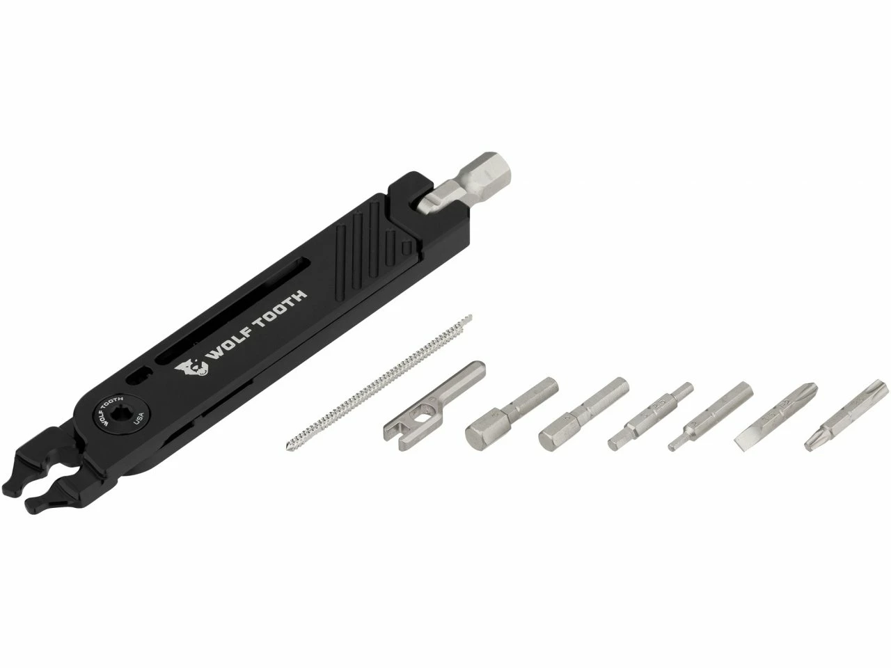 17 functions: spoke wrench; valve core wrench; flat head #3.5 and Phillips #2 screwdriver bits; 2, 2.5, 3, 4, 5, 6, and 8mm hex; and T10, T25 Torx-compatible bits; install and remove master links; clear tire sealant clogs from valve stem; tighten valve stem lock nut