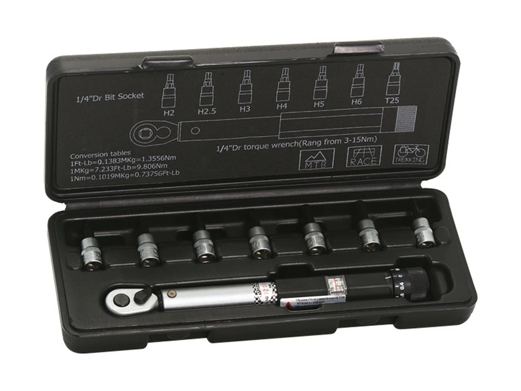 The XLC torque wrench is adjustable from 3 to 15 Nm and indispensable for the safe installation of high-quality bike accessories. It helps maintaining the indicated Newton metres of the product, thus securing the durability of the components. It is equipped with a flip-flop device to the right and to the left and with a 1/4 square plug connection.